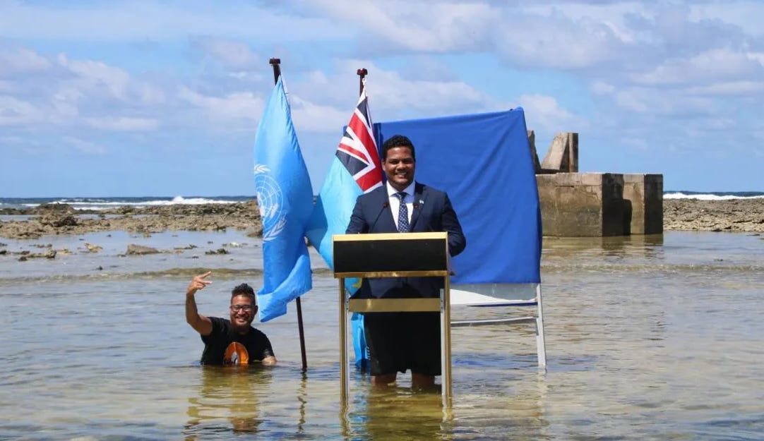 This includes the small island nation of Tuvalu. Located in the Pacific, about halfway between Hawaii and Australia, it is the second smallest nation in population (~11,900 people in 2021, only behind Vatican City). Tuvalu’s territory is equally modest—just 26 square kilometers spread across nine islands. But unlike most countries, Tuvalu is facing a unique crisis that threatens its very existence: rising sea levels.